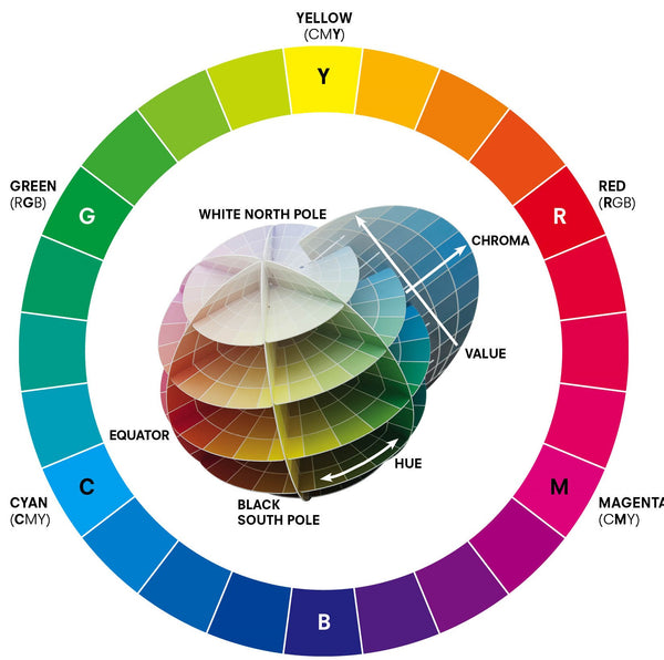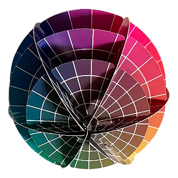 It is hopeless to figure out how to get from San Francisco to Tokyo on a 2D - flat - paper map. These cities seem to be in the western and the eastern “Ends of the world” respectively, and the conclusion is that you must cross the USA, the Atlantic and the European-Asian continent to get from one to the other. The map is a poor tool! In the same way, a flat color chart or fan deck does not give you knowledge of where each color “is” in relation to the others. Our 3D Color Theory Wheels are designed to develop your understanding of color, and make it possible to see, touch and grasp what hue, value and saturation really mean.