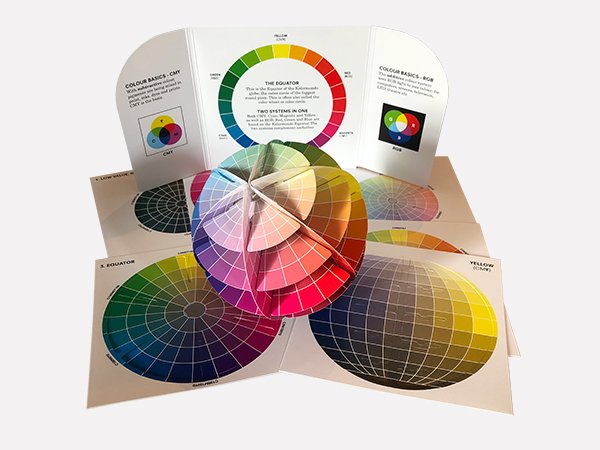 You will find the colour wheel/colour circle around the Equator, while the grey scale forms a pillar between the white North Pole and the black South Pole. Complementary colours are found across from each other. Kolormondo is inspired by the work of Runge, Gothe, and Itten, but we have modernized the globe by using CMY, Cyan blue, Magenta Red and Yellow as primary colours.